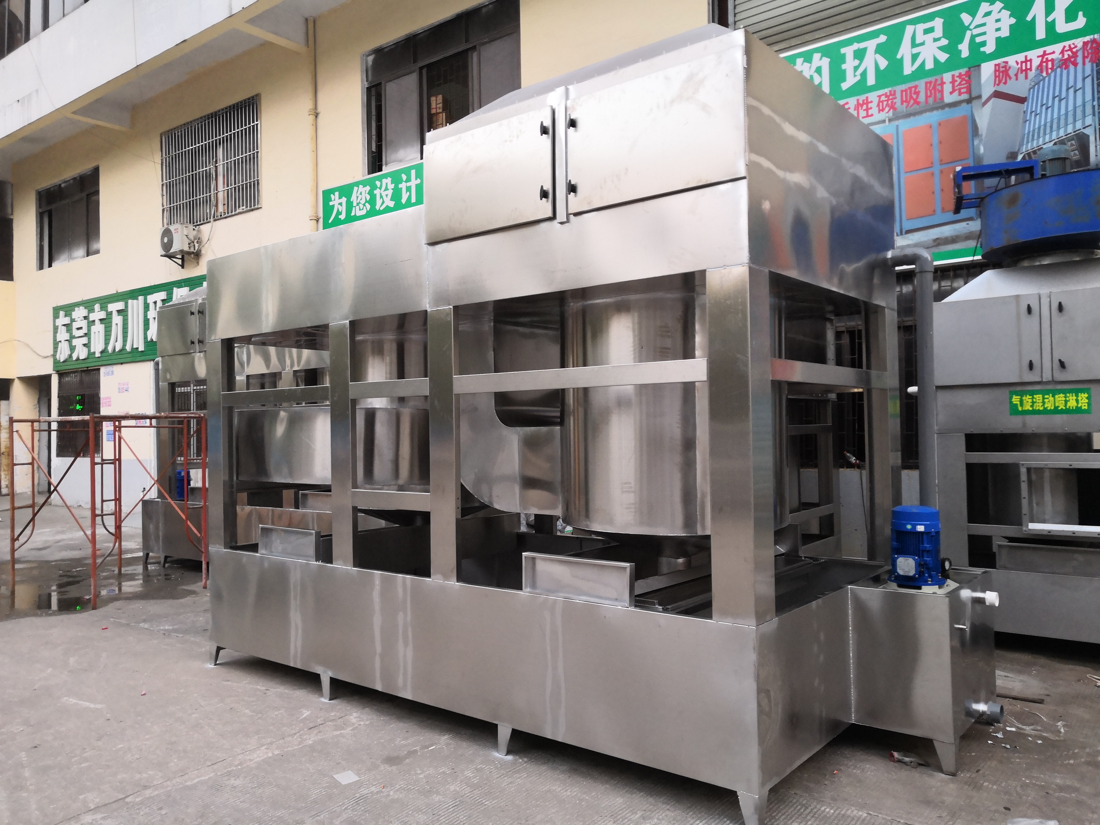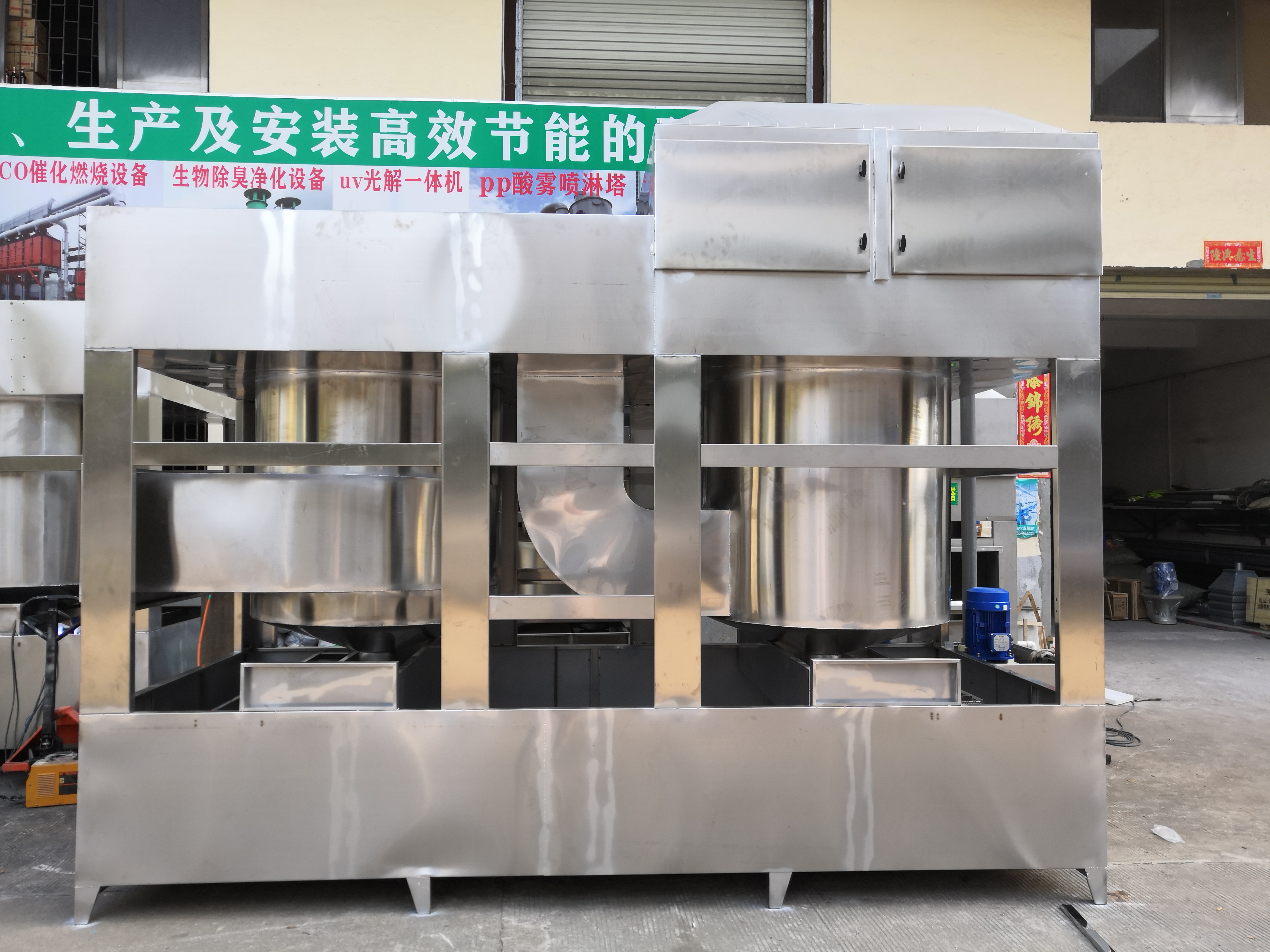 含塵含味氣體通過吸氣罩收集,在風(fēng)機(jī)的作用下,經(jīng)過管道輸送負(fù)壓進(jìn)入雙級氣旋噴淋塔。氣旋混流裝置快速運(yùn)轉(zhuǎn),多級連續(xù)的凈化使得含塵含味氣體與水霧充份混合,在離心的作用下達(dá)到氣液分離。氣旋桶內(nèi)部采用水泵循環(huán)給水,水在水箱經(jīng)水泵增壓后自螺旋噴嘴霧化而出,最后回流至水箱循環(huán)使用。分離出來的雜物下沉到水箱底部,經(jīng)凈化后的氣體進(jìn)入填料隔水層,然后由風(fēng)機(jī)排出。