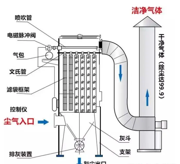 含塵氣體由風機通過吸塵管吸入箱體,進入濾袋過濾,粉塵顆粒被濾袋阻留在表面,經過過濾的凈化氣體由出風口排出,可直接排放在室內循環(huán)使用,也可根據需要排出室外。整個除塵過濾是一個重力,慣性力,碰撞,靜電吸附,篩濾等綜合效應的結果。除塵器連續(xù)工作一段時間后,濾袋表面的粉塵不斷增加,繼而進行清灰,粉塵抖落在集塵器(抽屜)中,再由人工進行處理 。