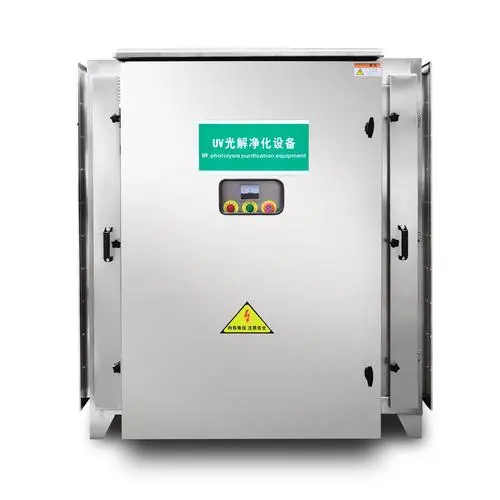 uv光解除臭設備:有機廢氣氣體處用排風設備輸入到UV光解設備后,運用高能UV紫外線光束及臭氧對惡臭氣體進行協(xié)同分解氧化反應,使惡臭氣體物質其降解化成低分子化合物、水和二氧化碳,再通過排風管道排出室外。