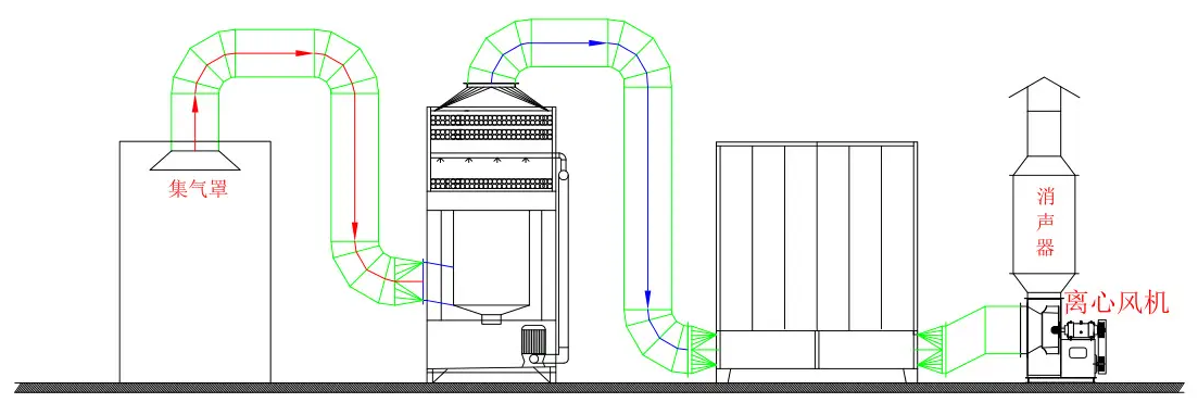 當(dāng)生產(chǎn)作業(yè)時(shí),煙塵廢氣在風(fēng)機(jī)牽引力的作用下進(jìn)入高速混流導(dǎo)軌裝置,煙塵廢氣在離心力的作用下進(jìn)行氣液乳化反應(yīng),在混流液的高速旋轉(zhuǎn)狀態(tài)下,污染物與旋轉(zhuǎn)液體充分混合吸收相溶增加煙塵比重,利用旋流裝置設(shè)計(jì)好的離心力達(dá)到氣液分離,分離后的氣體進(jìn)入環(huán)保填料吸附層,螺旋噴頭噴出的對(duì)應(yīng)溶劑均勻分布在填料上,由于填料的合理設(shè)計(jì),污染物浸透在填料的時(shí)間較長(zhǎng),與反應(yīng)液在專用環(huán)保填料表面有充分的氣液相溶反應(yīng)時(shí)間,從而達(dá)到達(dá)標(biāo)排放的目的。