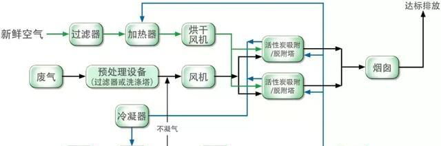 先將有機廢氣用活性炭吸附,當(dāng)快達到飽和時停止吸附,然后用熱氣流將有機物從活性炭上脫附下來使活性炭再生;脫附下來的有機物已被濃縮(濃度較原來提高幾十倍)并送往催化燃燒室催化燃燒成二氧化碳及水蒸氣排出。當(dāng)有機廢氣的濃度達到2000PPm以上時,有機廢氣在催化床可維持自燃,不用外加熱。燃燒后的尾氣一部分排入大氣,大部分被送往吸附床,用于活性炭再生。這樣可滿足燃燒和吸附所需的熱能,達到節(jié)能的目的。再生后的可進入下次吸附;在脫附時,凈化操作可用另一個吸附床進行,既適合于連續(xù)操作,也適合于間斷操作。