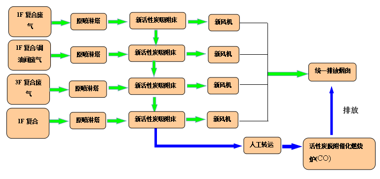 工程中在保留原有的噴淋塔情況下,獨(dú)立上新活性炭吸附床,凈化后的廢氣共用煙囪統(tǒng)一排放。吸附飽和的活性炭通過(guò)人工轉(zhuǎn)運(yùn)到催化燃燒爐進(jìn)行脫附再生,脫附抽屜和活性炭吸附床設(shè)計(jì)尺寸吻合,轉(zhuǎn)運(yùn)方便。