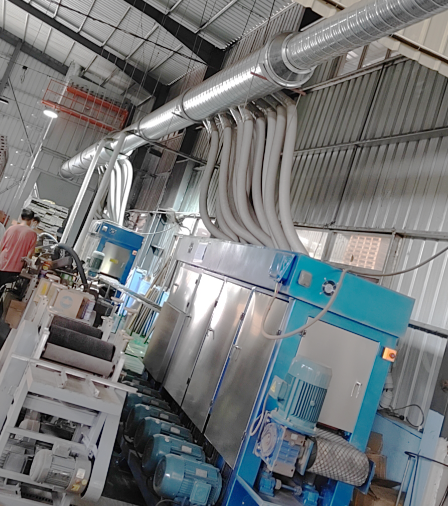 在木塑板生產(chǎn)的過程是要對其表面砂光、打磨處理,會產(chǎn)生大量的粉塵,萬川根據(jù)場地與粉塵類型設(shè)計(jì)了除塵方案與一配套木塑脈沖布袋除塵器。