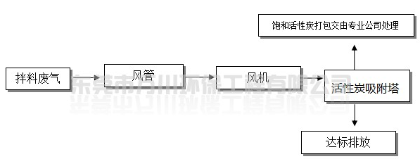 拌料固化產(chǎn)生的屬于揮發(fā)性的有機廢氣,通過車間內(nèi)合理布管,由引風機抽至車間外處理后排放,處理能力為18000m3/h,系統(tǒng)設于車間樓頂。