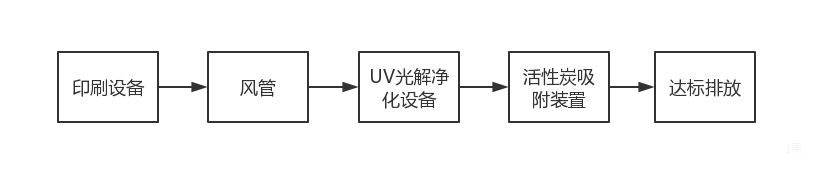 生產(chǎn)過程中產(chǎn)生的印刷廢氣通過風(fēng)機(jī)的作用下進(jìn)入風(fēng)管,首先廢氣會進(jìn)入U(xiǎn)V光解凈化設(shè)備,然后印刷廢氣會進(jìn)入活性炭吸附裝置,最后達(dá)標(biāo)排放。