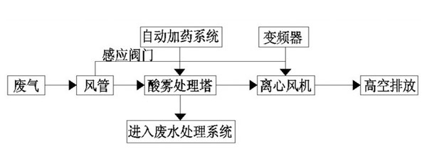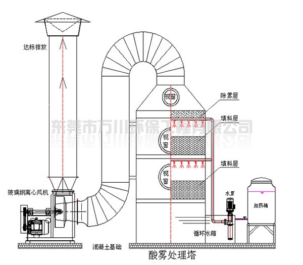 酸霧廢氣由風管進入酸霧處理塔,自下而上穿過填料層;循環(huán)堿液吸收劑由塔頂通過螺旋噴嘴,形成的水霧勻地噴淋到填料層中,沿著填料層表面向下流動,進入循環(huán)水箱。由于上升氣流和下降霧化吸收劑(堿液)在填料中不斷接觸,上升氣體中流質的濃度越來越低。使其酸霧得到凈化,達標排放。