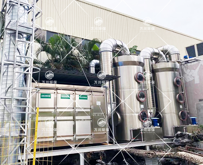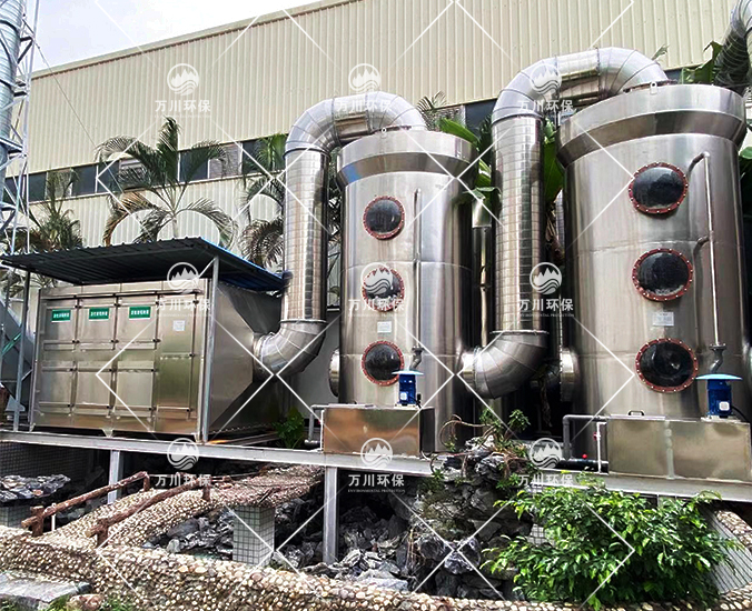 根據(jù)客戶需求和我司實(shí)地考察之后,最終采用‘兩級(jí)噴淋吸收法+活性炭吸附法’對其進(jìn)行處理。采用水噴淋一方面可以降溫,另一位方面能夠讓水吸收一部分的有機(jī)廢氣,降低后續(xù)活性炭吸附的負(fù)荷。